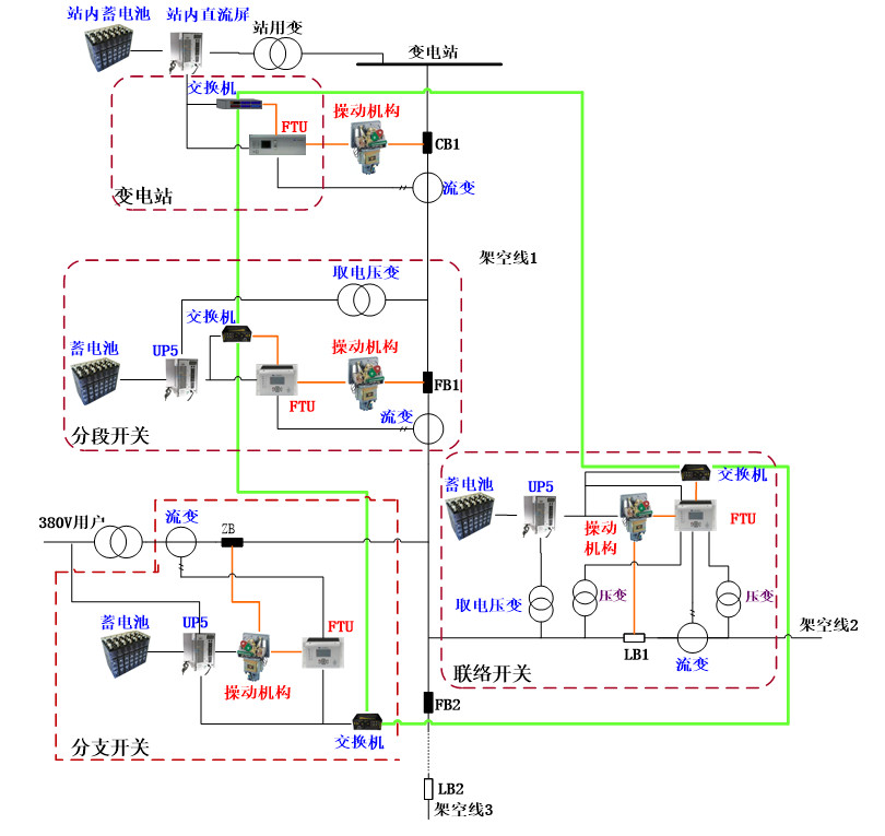 主干線分段開關設備配置:FTU、以太網交換機、斷路器及操動機構、流變、取電壓變、蓄電池組、電源管理模塊;