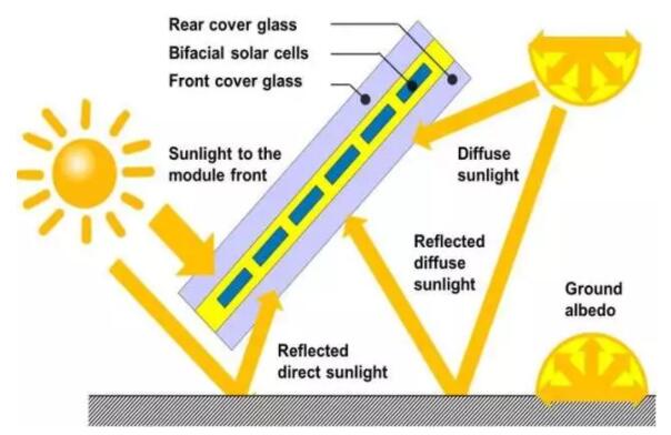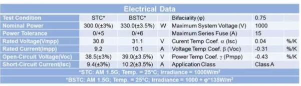 對于單面組件而言,定價的最重要的參考依據(jù)目前依然是標準測試條件(STC:組件溫度25ºC,入射輻照度1000 W/sqm,光譜分布為AM1.5G)下的功率標定。而對于雙面組件的電性能測量,我們在基于STC所作假設的基礎上增加雙面組件以37° 的傾斜角度和1米的離地高度安裝時的條件,由此確立了雙面標準測試條件(BSTC)。