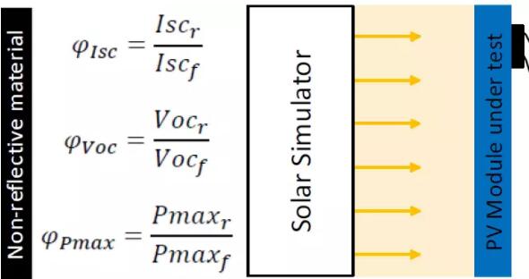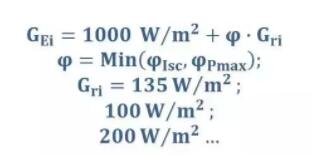 TÜV萊茵內部標準2PfG 2645/11.17 中規(guī)定可以使用IEC 60904-1-2中的單面輻照和雙面輻照測試方法,不過目前在TÜV萊茵的實驗室中使用的是單面輻照測試方法。除了BSTC下的測試,背面輻照度 (Gri) 為100W/sqm 和 200 W/sqm 時的IV測試結果也可以作為補充信息在測試報告中提供。 如下圖所示,單面輻照測試方法首先對雙面組件正反兩面分別在STC條件下進行功率測試,然后再測試組件正面在等效輻照度(GEi)下的光伏特性。等效輻照度(GEi)由以下公式計算得出: